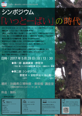 2017年6月10日(土)に「てんぶすホール」にて上演を予定している演劇公演「いっとーばい -逃げた知事 泉守紀-」(作:安和学治 演出:当山彰一)の上演に先立ち、公演作品の原作である「汚名-第二十六代沖縄縣知事 泉守紀―」(講談社刊)を執筆し、作品世界で描かれる第26代沖縄県知事・泉守紀氏を取材された野里洋さんにご登壇いただき、太平洋戦争末期の沖縄戦を前に、行政が行ったこと、行えなかったこと。また、軍の強制によって行わざる得なかったことなどをお話しいただき、これまであまり知られる機会のなかった戦時行政下の沖縄を振り返るシンポジウムを開催致します。無料でご参加いただけますので